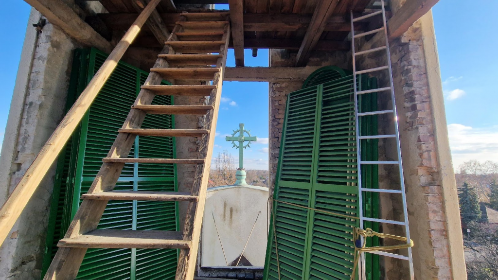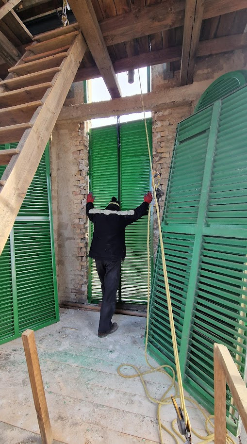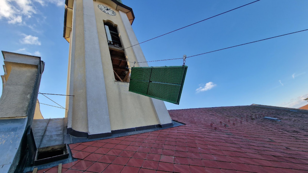 A templomtorony harangterének fa lamellái cserére szorulnak, egyes darabjai kihullottak, funkcióját csak részben képes ellátni. A régi korhadó fa lamellákat, zsaluziákat ki bontottuk. A templomtorony fa lamellái megépítésük óta, kiálltak minden vihart, építése óta a torony sose ázott be, de – a falakra felfelé mosott pókhálók tömegéből ítélve – felfelé fújt esőre nem volt tervezve, amelynek következtében az ázási nyomokból ítélve több száz liter víz juthatott a templomtoronyba. Mivel nem lehetett ablakkal lezárni, a szellőzés hiánya és a torony fa szerkezetének penészedésének veszélye miatt, ezért ez az esemény eleve ki van zárva a beázással kapcsolatos biztosítható káresemények közül. Az alsó részen beépített horganyzott és festett acél, a felső részen pedig a telekommunikációs szolgáltató kérésére az amúgy jó állapotú, de nem megfelelő profilú, dőlésszögű és sűrűségű kompozit anyagból készített lamellákat is le kellett cserélni. Az új lamellák megfelelő szögben lefelé lejtő Z profilúak sűrűbbek, és alakjuknak köszönhetően vitorla-hatás nélkül még a felfelé eső eső nagy részét is képesek most már valamelyest visszafordítani.