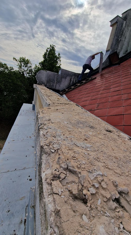 Több helyen ehhez hasonló bádogozási hézagok, elmozdult cserepek okozták a csapadék szivárgását a sekrestyetető alá: