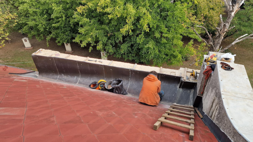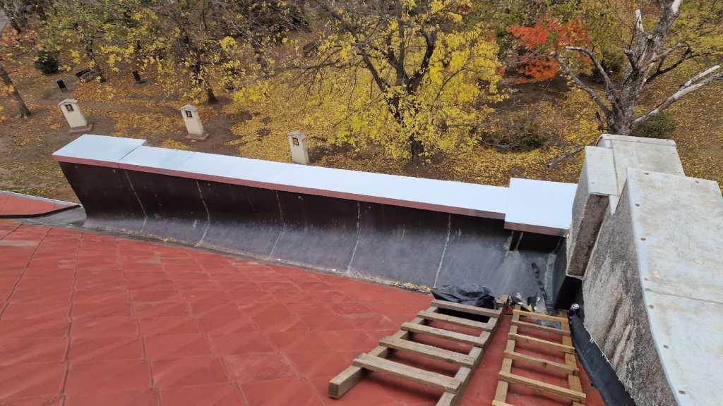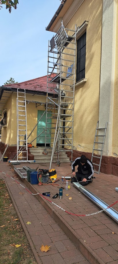 Életveszélyes attikafal felújítása: A templom jobb oldalán, a torony melletti attikafalon a horganylemez fedés megsérült, részben leesett. A helyreállítás során eltávolítottuk a sérült lemezek maradványait, megtisztítottuk a falazat tetejét a laza vakolat részek eltávolításával, majd 18 mm vastag OSB aljzatot rögzítettünk dűbelezéssel. Ezt követően 0,65 mm vastag horganylemezből készült, két vízorros fallefedést ragasztottunk teljes felületen enkolit ragasztóval. Az új fedés vízorr kialakítása biztonságosan lefedte az OSB aljzatot, és nem érintkezett a meglévő vörösréz lemezzel. A torony szegőlemezelésénél a falcsatlakozás tömítése elöregedett, több helyen kipergett, ezért a tömítést cseréltük, valamint a forrasztási hibákat kijavítottuk.