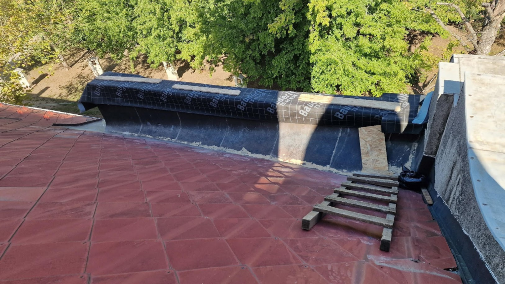 A sekrestye tető beázásának megszüntetése: A sekrestye ajtajánál jelentkező beázás megszüntetése érdekében átvizsgáltuk az ajtó feletti vápacsatorna szakaszt, amely rossz állapotban volt és több mechanikai sérülést mutatott. A feltárt hibákat kijavítottuk, a sérült szegéseket megigazítottuk, illetve szükség szerint cseréltük. A falazat és a lemezelés közötti hézagot szürke színű Sika tömítő anyaggal lezártuk.