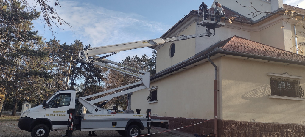 A függőeresz csatornáinak cseréje: Elvégeztük a templom függőeresz csatornáinak és levezető csöveinek cseréjét a meglévő tartóvasak megtartásával. Az új rendszert horganylemez elemekből alakítottuk ki a szükséges dilatációk biztosításával. A kivitelezés során 110 fm ereszcsatorna és 52 fm lefolyócső került beépítésre a szükséges idomokkal együtt.